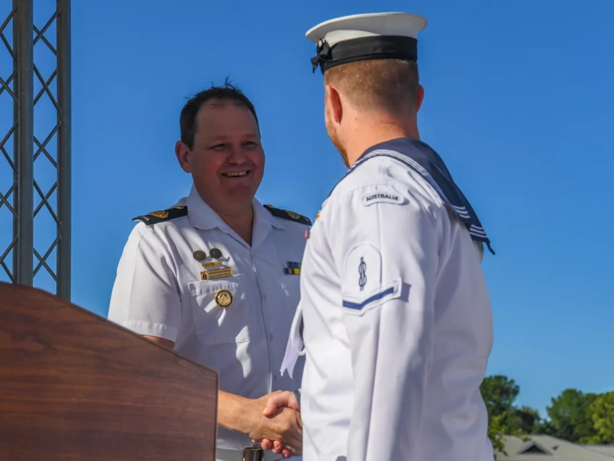 Picture: Kellie Randall/RAN Warrant Officer Andrew Bertoncin congratulates a Royal Australian Navy sailor.