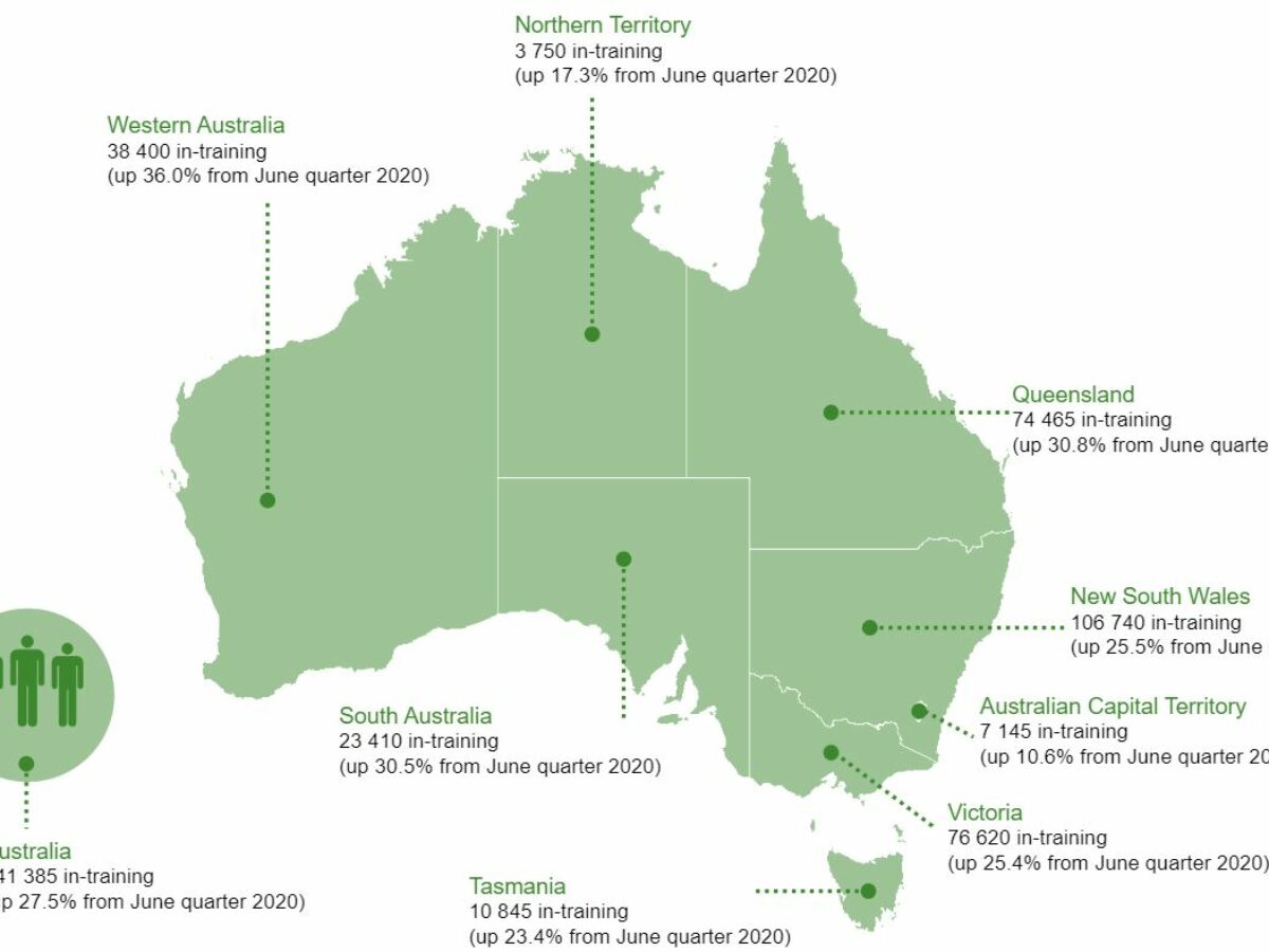 As at 30 June 2021, there were 341,385 apprentices and trainees in-training, an increase of 73,665 compared with 30 June 2020.