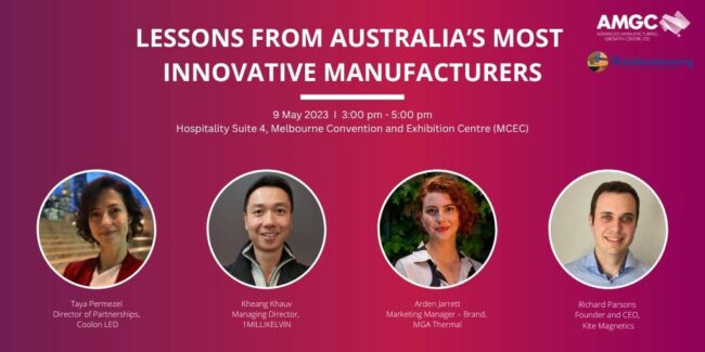 Join @AuManufacturing and the Advanced Manufacturing Growth Centre on the first day of Australian Manufacturing Week for a special event: Lessons from Australia’s most innovative manufacturers. We are both proud and very happy to be collaborating with our friends at AMGC on this presentation, to be held Tuesday May 9 from 3:00 pm – 5:00…