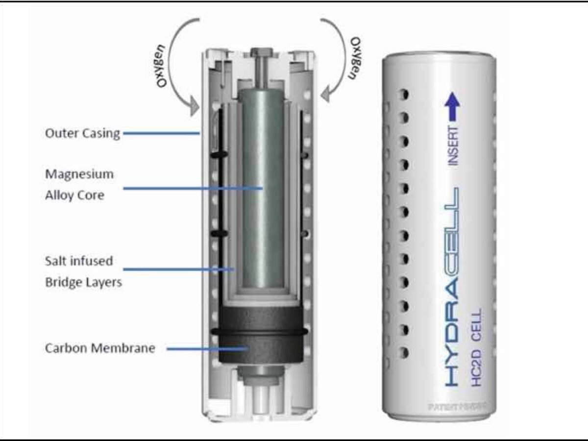 The form factor of the core product is the size of two D cells, and the main advantage claimed for the technology over conventional dry cells is a shelf life of decades — a HydraCell is inert until dipped in water — and the low environmental impact of used cells.