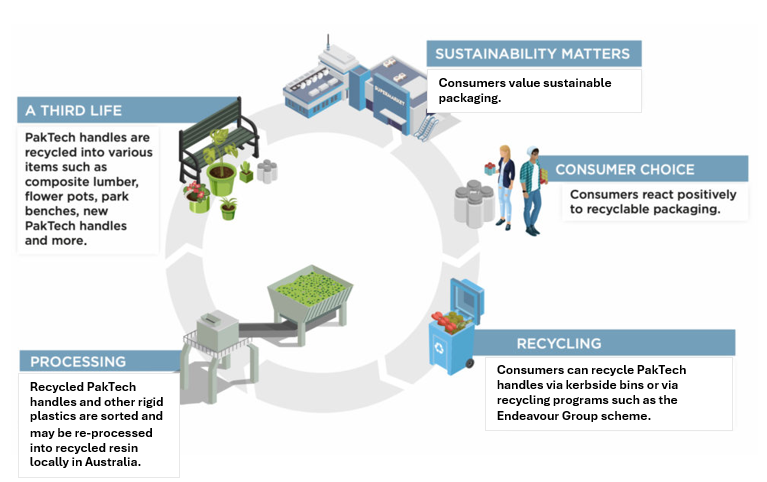 It adds that PakTech’s can handles have recently been assessed as recyclable through the Australian Packaging Covenant Organisation (APCO) ARL program,