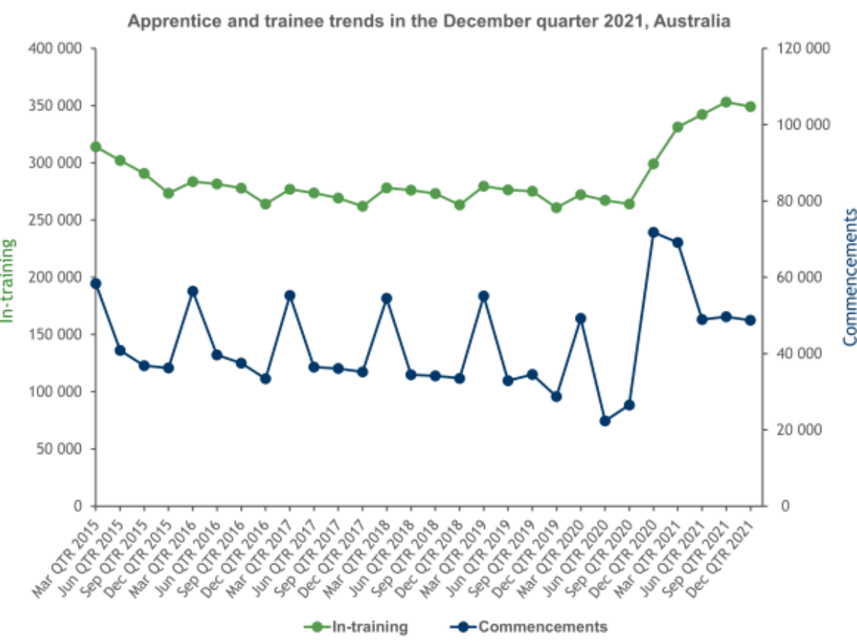 The centre said there were 349,235 apprentices and trainees in-training as at 31 December 2021, 16.8 percent higher than at the same time in 2020 and only slightly lower than at the end of the September quarter 2021.