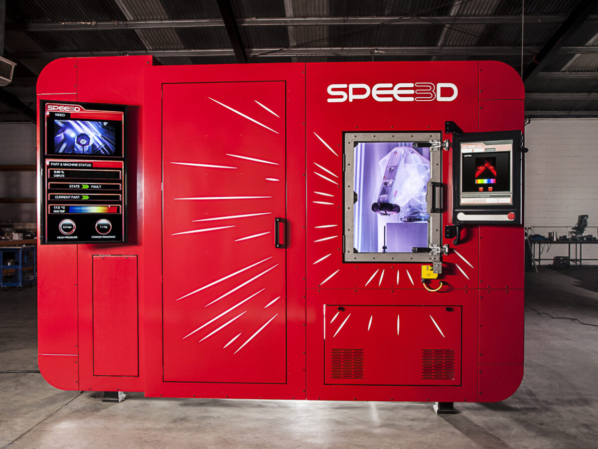 Spee3D makes machines that create parts using cold spray methods, which blast metal powders through a nozzle at supersonic speeds, propelled by compressed air, fusing powder and building up a shape “100 to 1000 times faster” than laser-based AM methods.